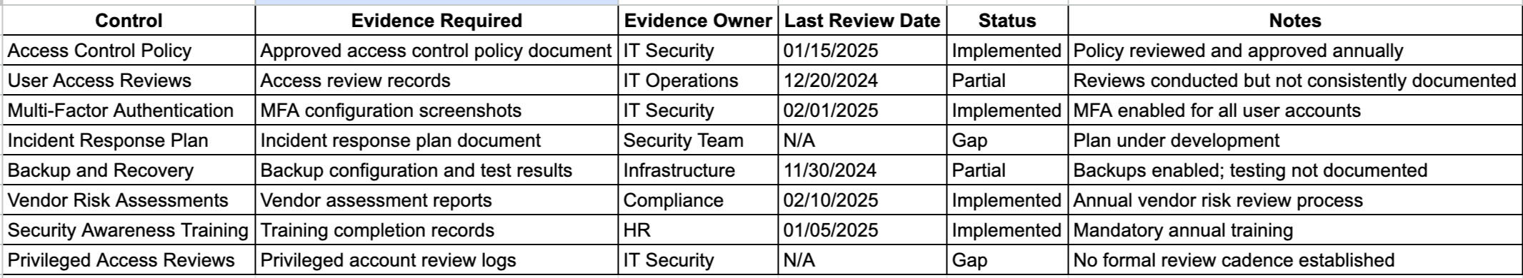 This artifact reflects how compliance teams maintain visibility into control implementation, identify evidence gaps, and support audits through clear ownership and documentation practices.