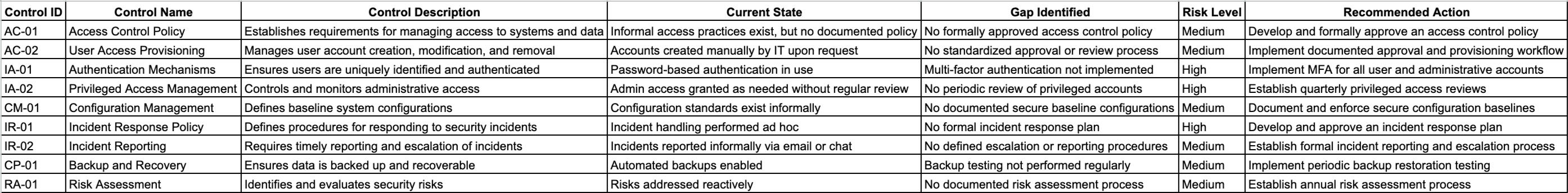 This project demonstrates a control gap analysis commonly performed as part of governance, risk, and compliance (GRC) activities. The objective was to evaluate current-state security controls, identify gaps, and recommend remediation actions using realistic assumptions for a cloud-hosted SaaS environment.
